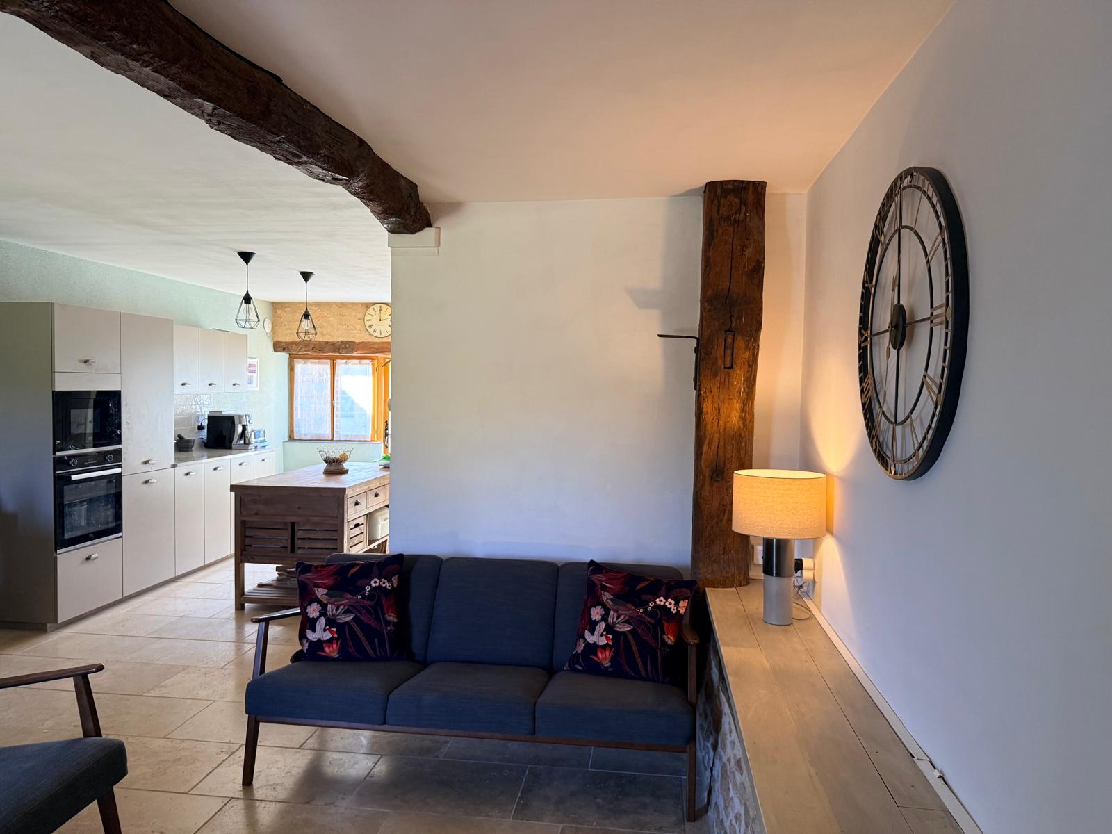 An open plan kitchen area with a fully equipped kitchen with dishwasher, built in single oven and microwave, washing machine, dining, and living area with a wood burning stove. There is a lovely terrace at the back of the gite with seating and Weber bbq, overlooking the field. On the second floor there are three bedrooms – two twin/doubles and one single with bathroom and shower. There is an additional toliet and sink on the ground floor.